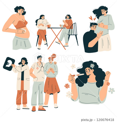 Cartoon Color Pregnancy Different Scenes Concept Set Flat Design Style with Elements Thin Line. Vector illustration