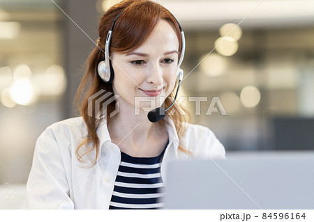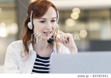 パソコンに向かって話すヘッドセットをつけた外国人女性