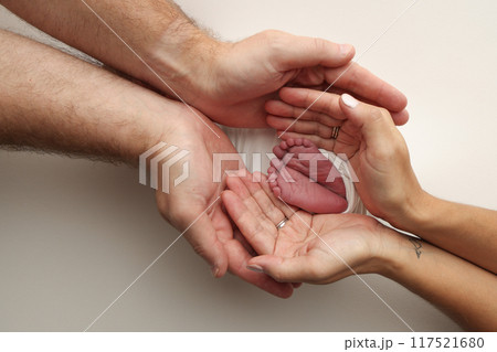 The palms of the parents. A father and mother hold the feet of a newborn child in a white blanket on a white background.. The feet of a newborn in the hands of parents. Photo of foot, heels and toes