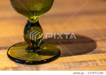 翠綠玻璃杯腳與木質桌面上的光影折射