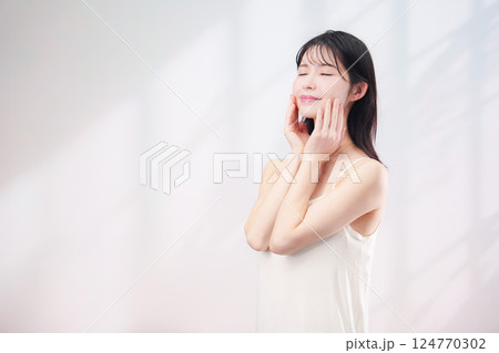 笑顔でお肌のケアをする若い女性(シンプル背景)