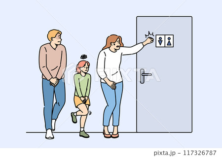 Male female waiting toilet. People need poo or pee and wait near door in public toilets. Restroom wc in cafe theater mall airport, recent vector characters