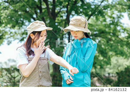 山で虫に刺される女性たち