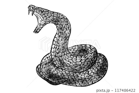とぐろを巻いて威嚇する蛇、手描き水墨画風