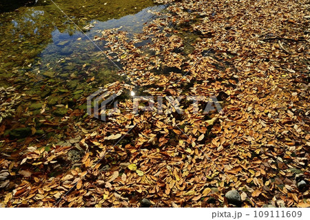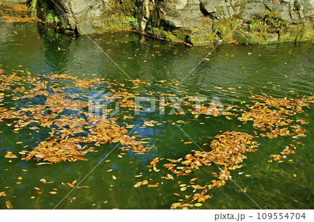 埼玉県嵐山町の紅葉する嵐山渓谷の川面に溜まる落葉