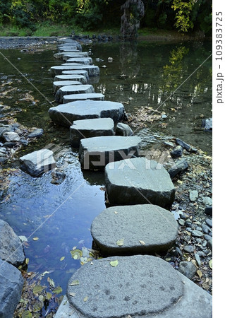 埼玉県嵐山町 紅葉の武蔵嵐山渓谷槻川の飛び石に紅葉の倒影