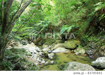森の中を流れる比地川渓流(沖縄県国頭郡国頭村・比地大滝)