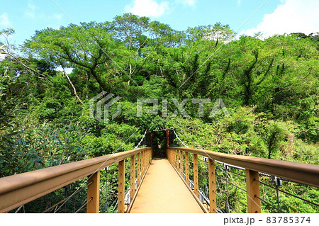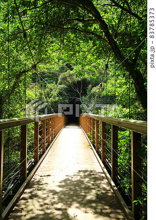 緑のトンネルを抜ける吊り橋(沖縄県国頭郡国頭村・比地大滝)