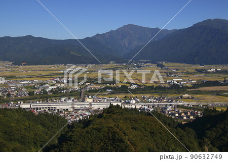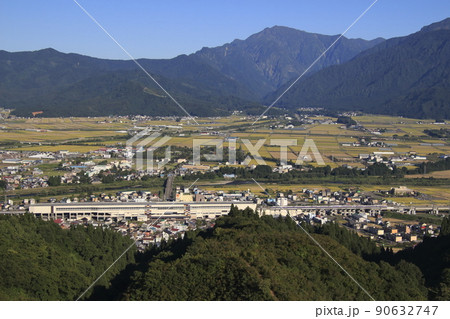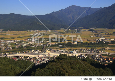 夏の浦佐駅西口と南魚沼市大和地域エリア俯瞰