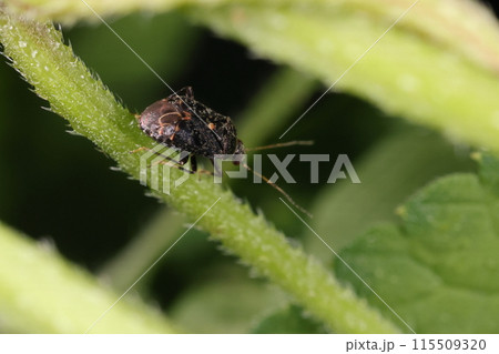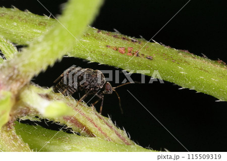 生き物 昆虫 ヒメセダカカスミカメ、大きさは三~四ミリ。黒褐色の体で背中は細い毛に覆われています