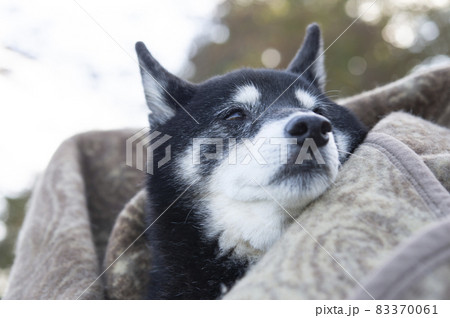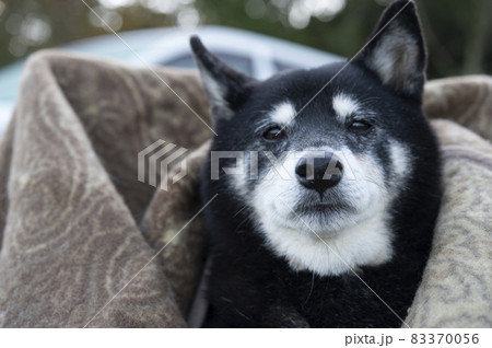 毛布に包まれる黒柴犬の画像素材(写真・イラスト) 1ページ目
