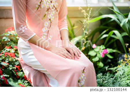 Portrait of Asian girls with Ao-Dai Vietnam traditional dress costume sitting in flower garden