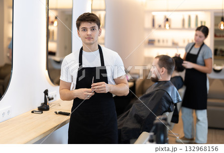 Professional barber grooming male client's hair with scissors, vintage barber pole framing traditional barbershop setting