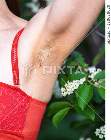 Closeup of long dark hair growing under arm of young female. Concept of hygiene, natural beauty, feminity and body hair growth