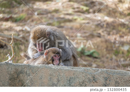 子供を抱き毛繕いするニホンザル 嵐山モンキーパークいわたやま