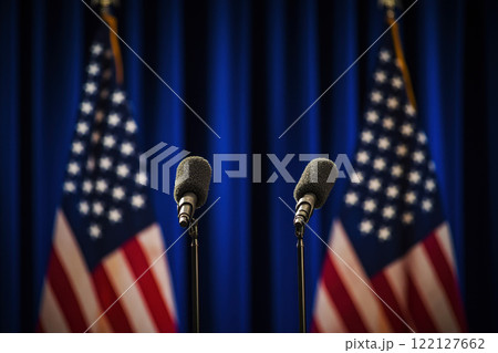 Empty podium with microphones and American flags in a auditorium setting. generative ai