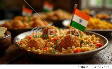 Indian food in colorful bowls with the Indian flag, celebrating India Independence Day in a festive background
