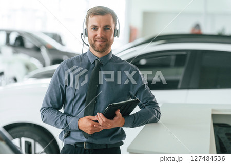Manager is in the headphones and with notepad. Handsome car dealership worker is with electric vehicle