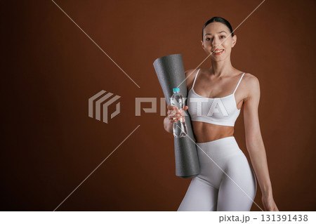 Mat and bottle of water in hands. Beautiful fitness woman is in the studio