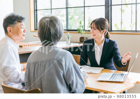 パソコンでアジア人高齢者夫婦に説明するスーツ姿のビジネスウーマン