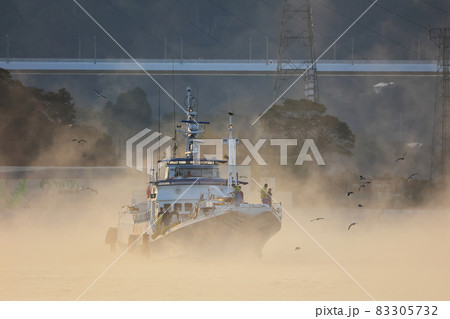 気仙沼湾の気嵐と漁船