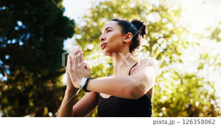 Breathing, meditation and yoga with woman in park for holistic exercise or wellness routine. Awareness, balance and inner peace with yogi person outdoor in nature for fitness, mindfulness or pilates