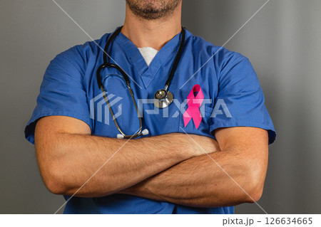 Medical professional showing support for breast cancer awareness in blue scrubs