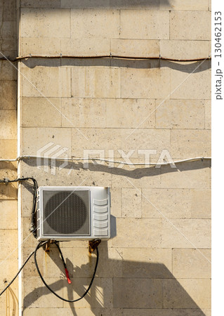 Air conditioners on the facade of yellow historical house. An air ventilation and cooling system.