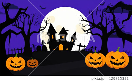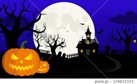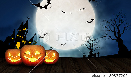 ハロウィンかぼちゃと満月とコウモリ イメージイラスト