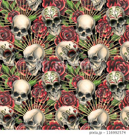 Human skulls with an ornament, red roses in a golden crown, branches. Hand drawn watercolor illustration for Halloween, day of the dead, Dia de los muertos. Seamless pattern on black background