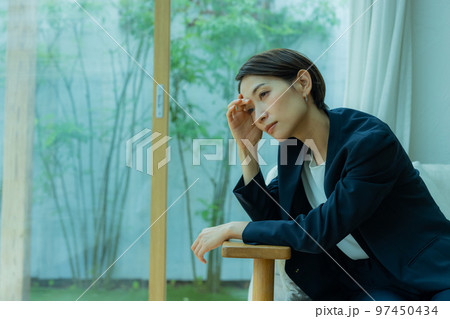 疲れ目の女性 眼精疲労に悩む女性 片頭痛 悩む女性 不安を抱える女性 何かを考える女性
