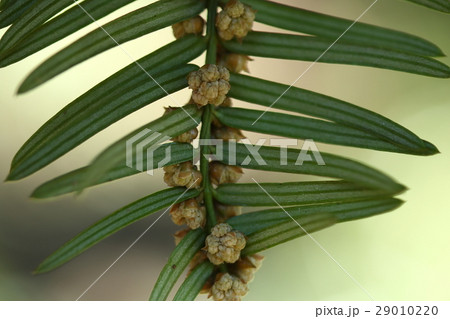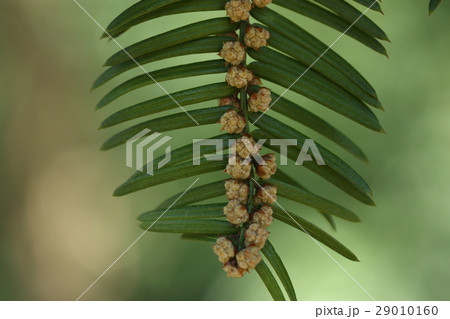 自然 植物 カヤ、六月初旬。葉先に緑色の若い果実がのぞいています