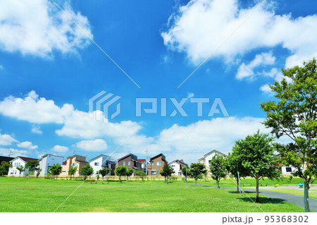 青空の街並み 新興住宅街と公園の風景