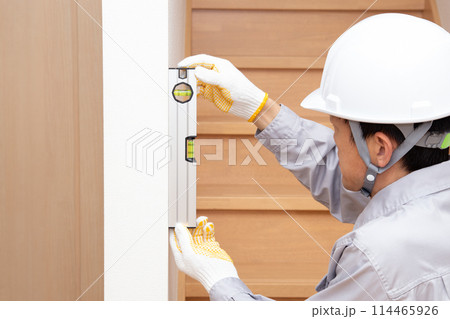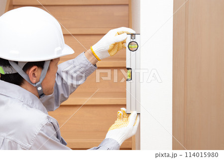 水平器(水準器、レベル)を使って壁の垂直を調べる作業員