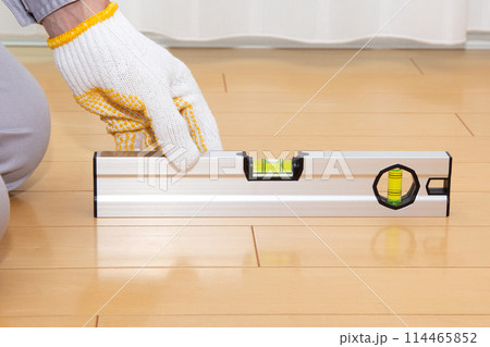 水平器(水準器、レベル)を使って床の水平を調べる作業員