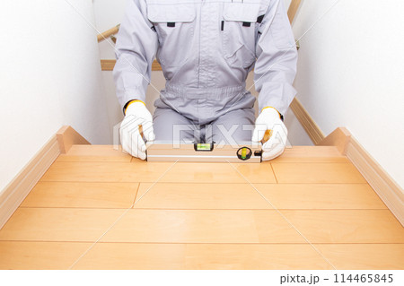 水平器(水準器、レベル)を使って床の水平を調べる業者