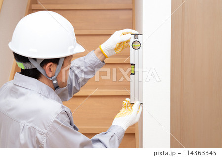 水平器(水準器、レベル)を使って壁の垂直を調べる作業員