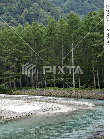 長野 上高地 初秋の梓川と桧林(雨上がり)