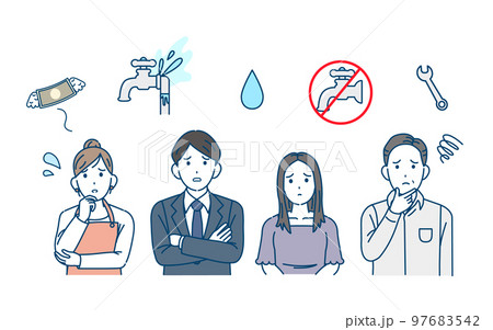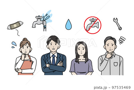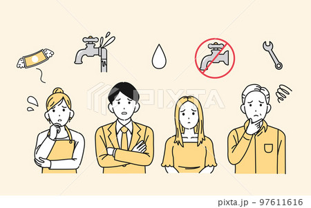 水漏れや断水などの水道関係のトラブルに困る人達のイラスト