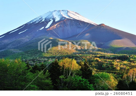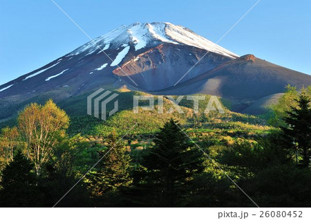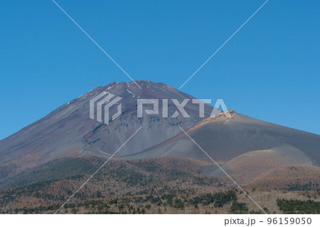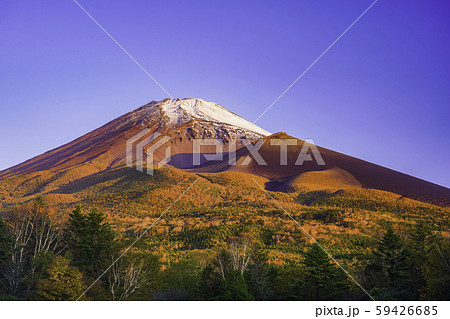色彩豊かな朝の富士山の岩肌と樹木