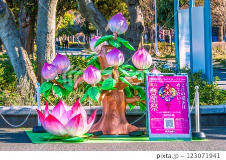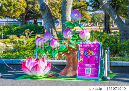 日本の横浜都市景観2月春節祭。山下公園・ワーフハウス前などを望む。左奥に氷川丸=令和7年2月13日