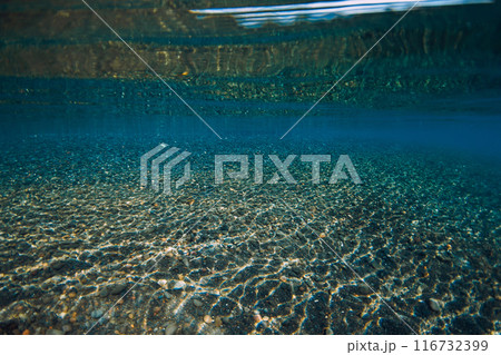 Underwater crystal ocean with stone bottom and reflection on surface. Sea textures