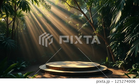 Wooden Podium in Dense Jungle with Sun Rays | Natural Background for Product Display or Advertisement.