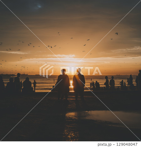 Group of people watching sunset on beach silhouettes each face horizon with warm glow, birds fly across sky, creating peaceful and scenic atmosphere at dusk
