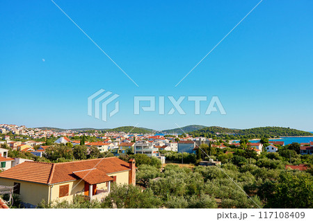View on coastal town with red roofed houses and lush green hills under clear blue sky. Touristic Mediterranean town near Adriatic sea for summer holidays