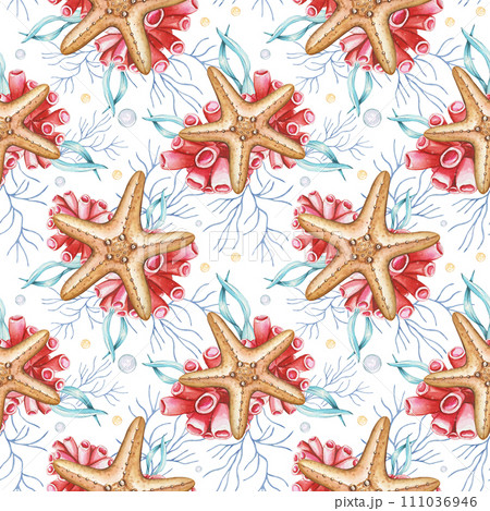Sea seamless pattern with watercolor starfish, algae, corals