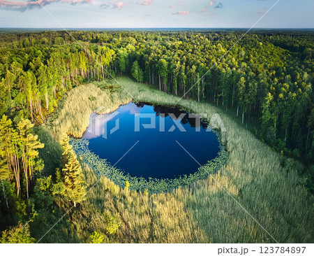 Autumn forest lake in Poland. Autumn lake in autumn forest. The autumn foliage of the trees is reflected in the lake water