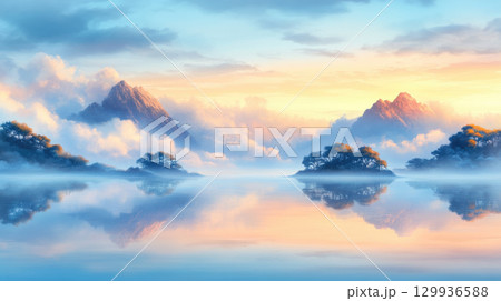 serene landscape featuring misty mountains and tranquil lake at dawn, reflecting soft colors in sky