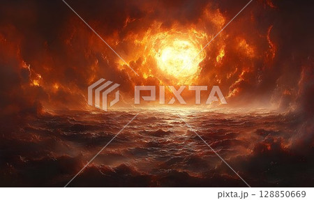 Fiery Ocean Under a Blazing Sky: A Vision of Apocalyptic Beauty