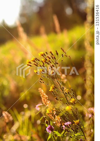 Cute illustration, orange sky with light blue clouds, white fence and green bushes. Calmness, freedom, nature. Design that requires freshness, cuteness, stylish background.